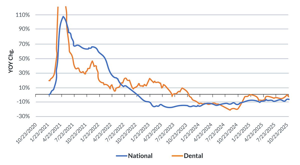 After a period of heavy volatility, job postings for dental offices have flattened and now closely track national hiring trends. The market is steadier, with year-over-year growth just above zero.