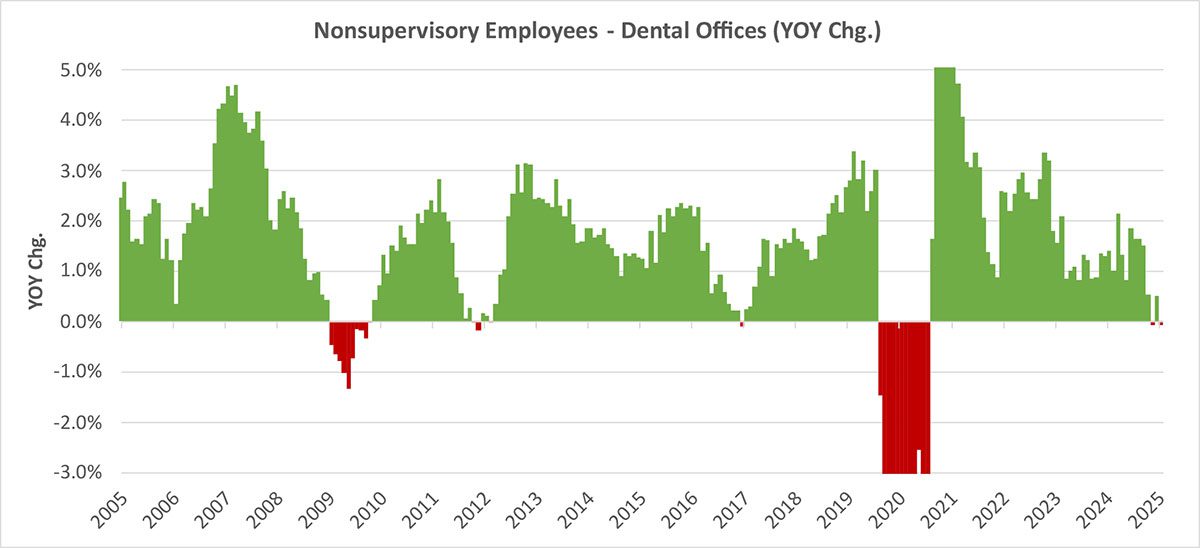 Employment in dental offices has returned to modest, steady growth after years of extreme swings. The staffing environment is normalizing.