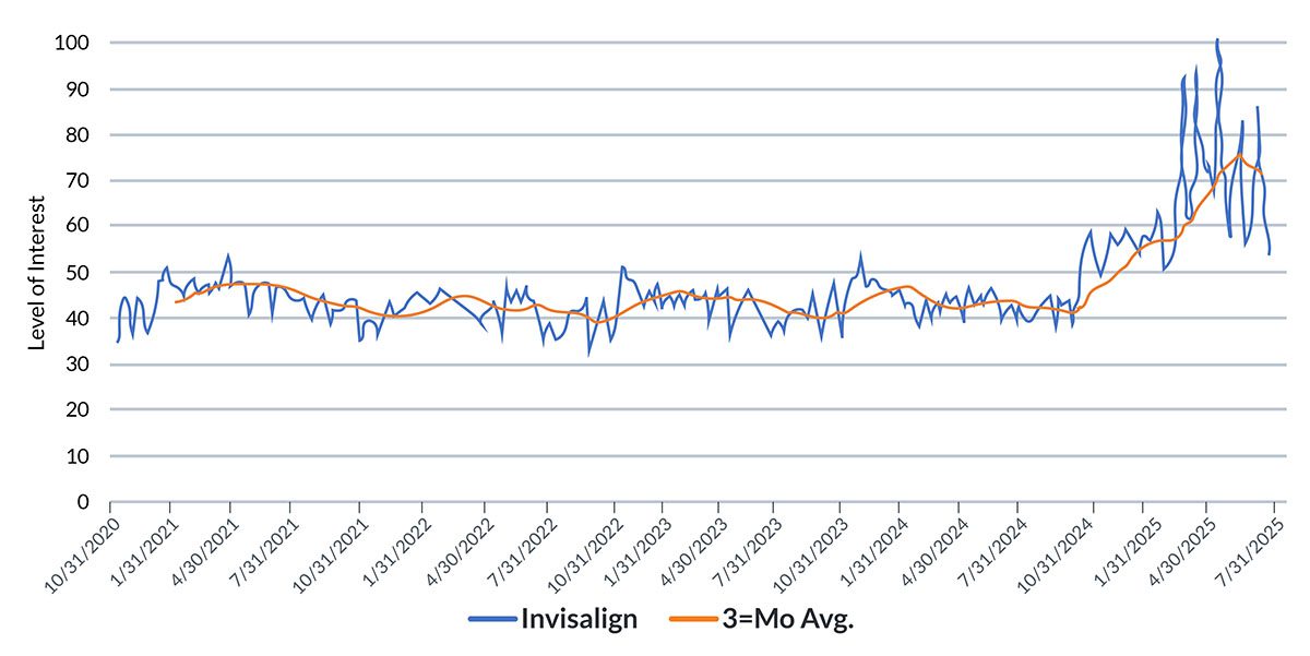 Interest in Invisalign surged in early 2025 but has since slowed. Demand remains higher than in previous years, but momentum has eased.
